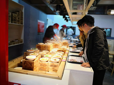 我們通過深度研究和設(shè)計,找到了一種陣列式小蒸籠保溫呈現(xiàn)的方式,把小蒸籠整齊排列,然后給每個小蒸籠輸入蒸汽,每一個蒸籠一碗菜,相同菜品的蒸籠摞在一起,這樣方便顧客點菜,存菜量大,保溫效果好,顧客對菜品也一目了然,想吃什么點什么,保溫時間長了也不會有湯水滲入,菜越蒸越香。這個創(chuàng)新,使得瀏陽蒸菜模式的菜品陳列方式上升了很大一個臺階,當(dāng)然,我們?yōu)檫@個模式申請了實用新型專利,保護(hù)我們的創(chuàng)新成果。