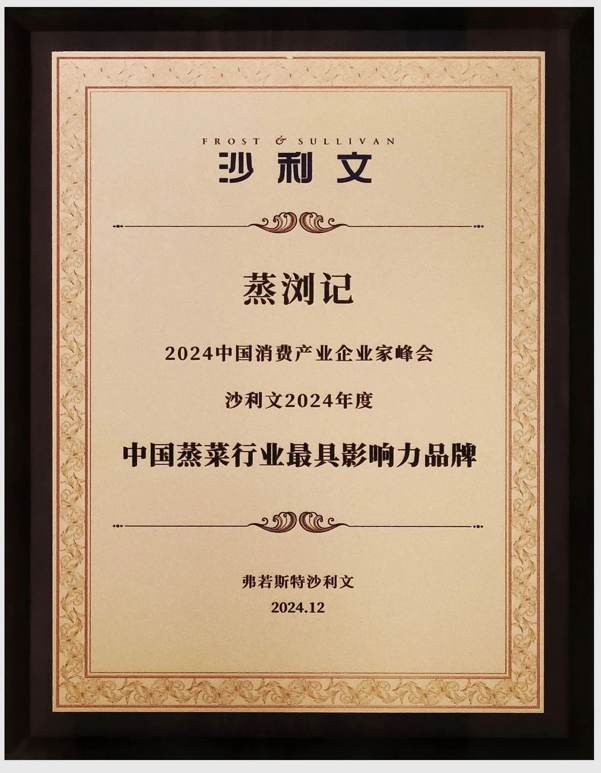 歷經奮楫篤行的2024年,瀏陽蒸菜標準示范品牌蒸瀏記在歲末年終收獲了一份最沉甸甸的行業肯定——獲評“沙利文2024年度中國蒸菜行業最具影響力品牌”。